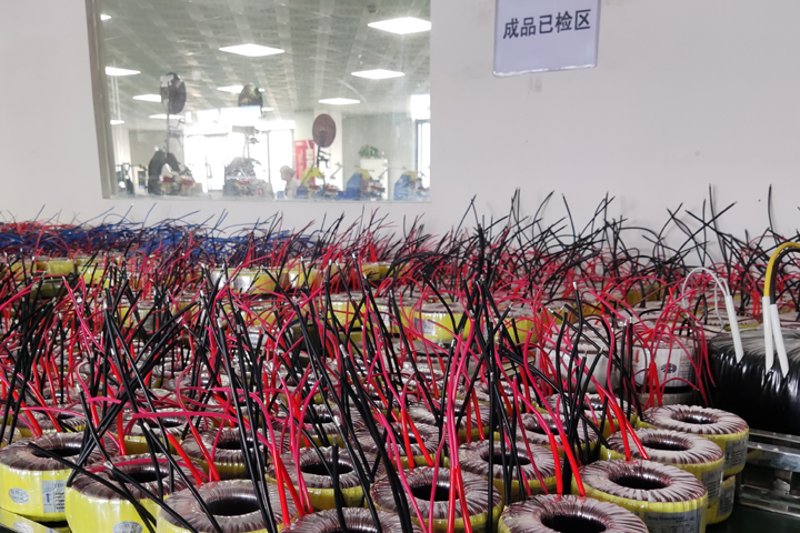圣元倉庫的一角存放著已經(jīng)檢測好的成品環(huán)形變壓器,準備發(fā)出。