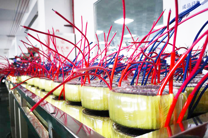 圣元電器的員工認(rèn)真地將制作并檢測(cè)完畢的環(huán)形變壓器整齊在擺放區(qū)的小推車上。