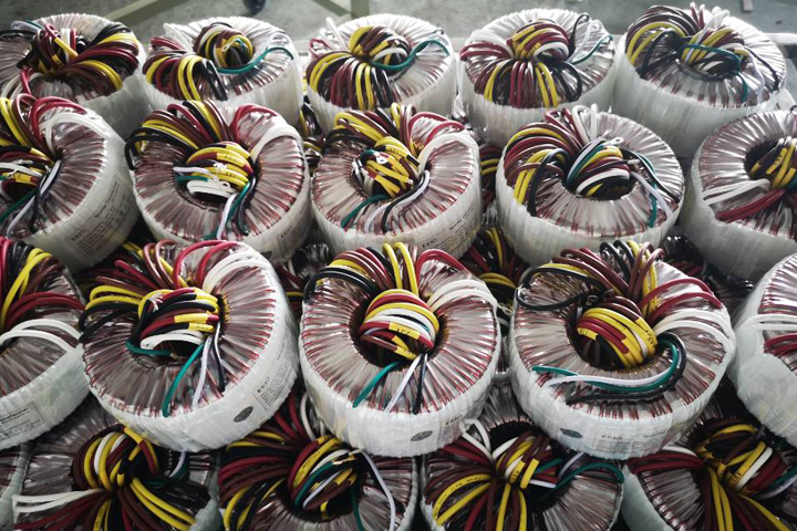圣元電器員工將隔離變壓器引線繞制整齊擺放,等待包裝出貨。